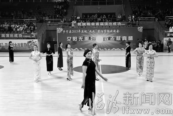 臨汾新聞網訊 10月20日晚,鄉寧縣200余名健身志愿者在該縣體育館參加“夕陽無限好,敬老獻真情”九九重陽節聯歡晚會,圖為鄉寧縣旗袍協會成員表演旗袍走秀。(王娟)