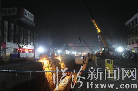 凌晨1點,記者在市區堯豐市場附近的施工現場看到,沿線開挖好的管溝附近集結滿了大型吊裝機械,正在吊裝管道。