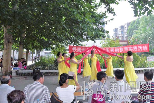 臨汾新聞網訊 為了豐富孩子們的暑期生活,日前,堯都區車站街辦事處鐵路社區黨支部與市第三小學,舉辦了暑假學生融入社區文藝活動,讓學生們在活動中享受快樂、受到教育。圖為社區大媽們正在表演文藝節目。周云瑞 攝