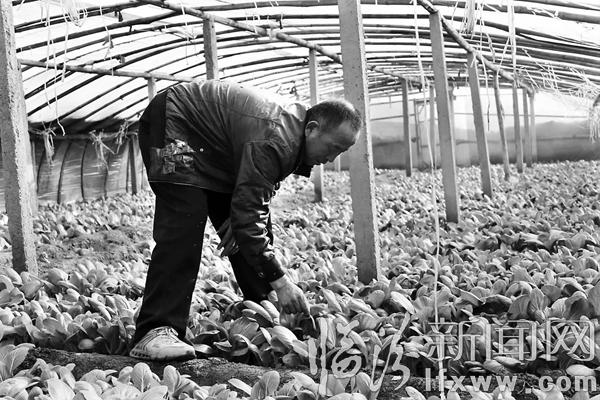 臨汾新聞網訊 近日, 在堯都區屯里鎮西蘆村菜農老楊家大棚里綠意盎然, 綠油油的小油菜長勢喜人,該批油菜將在春節前上市。圖為老楊在棚內管理蔬菜。