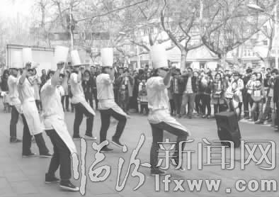 臨汾新聞網訊 3月26日上午,堯都區解放路街頭突然冒出數名穿著廚師服的年輕男子,伴隨著一首歡快的歌曲他們突然跳起舞來,引得不少路人駐足圍觀。短暫的歌舞展示后,這群年輕人又分散在人流中。