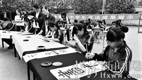 臨汾新聞網訊 5月6日下午,堯都區金殿二中第三屆校園藝術節在校內國旗臺前舉行,內容有版面展示、匯報演出、歌詠比賽、乒乓球比賽和廣播操比賽等。其中書法、繪畫興趣小組在校內展出其作品,匯報演出則是由書法、讀書、體育、繪畫興趣小組表演節目,并有專業老師作為評委點評。校園藝術節極大地豐富了學生的校園新生活,增強了學校的生機和活力,調動了學生學習的積極性和主動性。圖為學生們進行現場書法創作。(金殿)