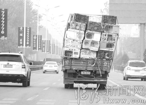 臨汾新聞網(wǎng)訊 11月12日,在我市108國道堯都區(qū)屯里鎮(zhèn)梁村附近,一輛貨車載滿廢舊洗衣機(jī),但由于貨物過高向一面傾斜,實(shí)在危險。 記者 張?zhí)N強(qiáng) 攝
