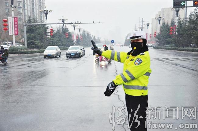臨汾新聞網訊 2月21日凌晨,我市堯都區境內迎來了立春以來的第一場雪,突如其來的降雪,在給市民帶來清新空氣和舒適感覺的同時,也給道路行車安全帶來嚴重影響。為積極應對雨雪惡劣天氣可能出現的交通堵塞,避免發生交通事故。堯都公安交警全警出動,履職盡責,全力疏導交通,確保轄區道路交通安全暢通。 記者趙京紅攝