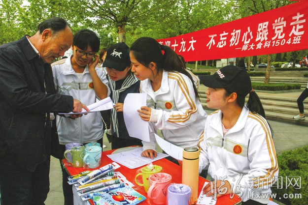 臨汾新聞網訊 4月26日,在廉政廣場,山西師范大學食品科學學院的學生們舉辦了主題為“青春喜迎十九大不忘初心跟黨走”的宣講活動。活動中,同學們以黨的十八大以來的政策制度和有獎答題活動,吸引了不少市民前來答題。