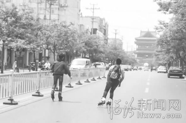 臨汾新聞網訊 5月1日13時許,在市區鼓樓東大街,兩名少年在街道上輪滑競賽,其中一名少年在快速滑行時還耍起了“花樣”,在兩個車道間來回穿梭。