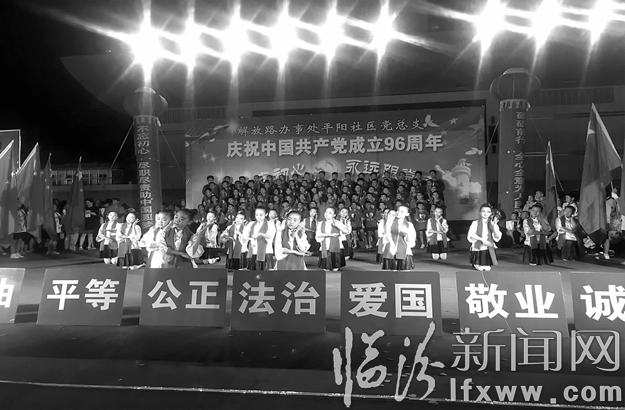 臨汾新聞網訊 6月27日晚,堯都區解放路辦事處平陽社區黨總支在平陽廣場舉行了“不忘初心永遠跟黨走”慶祝活動。舞蹈《七彩中國夢》《東方紅》、大合唱《沒有共產黨就沒有新中國》《我把最美的歌兒唱給媽媽》、快板《做個合格好黨員》、詩朗誦《和諧社區贊歌》……一個個精彩紛呈的節目表達了大家對黨的無限祝福和構建和諧社區的決心。