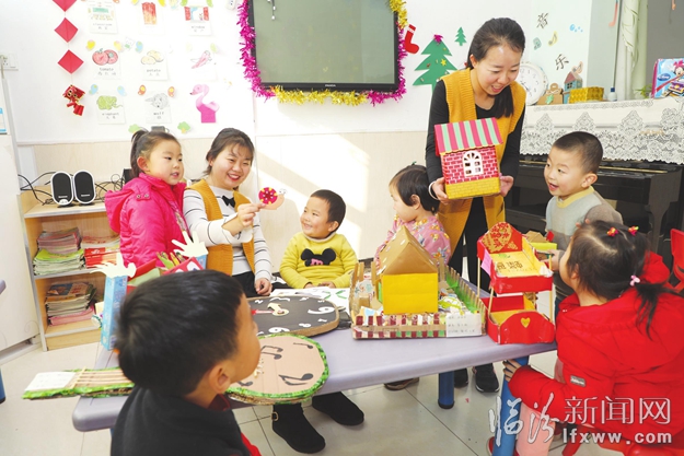 臨汾新聞網訊 “快過年了,我給小鳥做了一個新房子,希望小鳥在里面快樂地生活?!?2月27日,記者在堯都區十棟樓幼兒園看到,這里的老師和孩子們將一些廢舊的紙箱制作成一個個精美的小房子、小玩具、小動物,他們用這樣的活動迎接新年的到來。