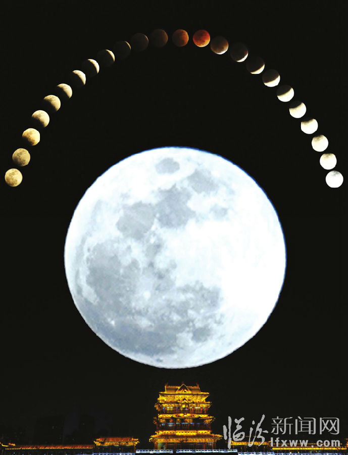 臨汾新聞網訊 1月31日晚,超級月亮”飄紅網絡,刷爆朋友圈。隨著夜幕降臨,太陽、地球、月球三者逐漸處于一條直線,整個月亮緩緩“走”進地球的影子中。19時46分許,在我市上空,2018年首次月全食的天象盛宴開始,月亮從左下角開始慢慢被“吞噬”,整個過程一直持續到23時13分,月亮又慢慢地被“吐出”,嶄新如初。據悉,上次發生這種天文現象是1866年3月31日,距今152年。 記者郝海軍攝