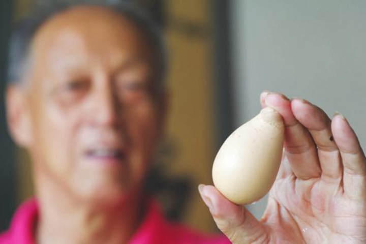 據(jù)了解,這枚“怪蛋”是馬英斌老伴兒當(dāng)天早上在菜市場購買的,回家后才發(fā)現(xiàn)“怪蛋”不僅像“葫蘆”,還像“不倒翁”,很有藝術(shù)氣息。于是,他計(jì)劃把這枚“怪蛋”保存好,看能不能加工成一個藝術(shù)品。記者郝海軍攝