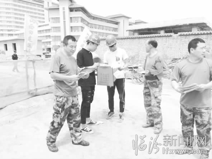 圖為工作人員在建筑工地散發宣傳資料。