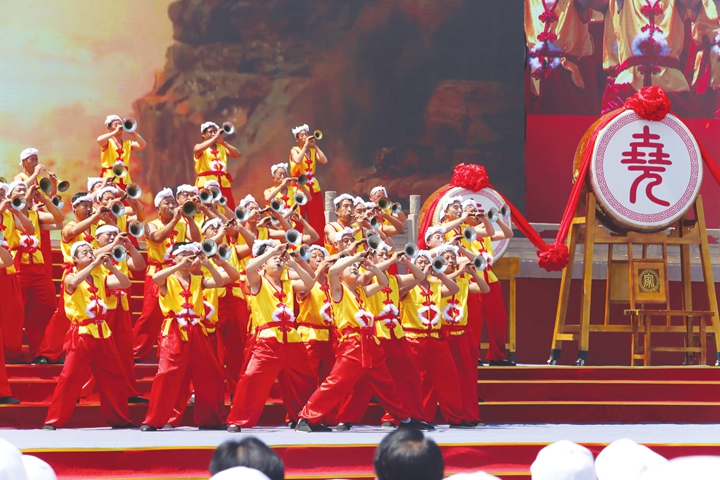 尾聲“筑夢中華”——嗩吶表演《壺口漢子》讓觀眾領略“秋風卷起千層浪,晚日迎來萬丈紅”的壺口瀑布;歌舞《中國夢》尋找炎黃子孫之根,實現“圓夢中華”愿景,拉開堯都文化旅游節的大幕。
