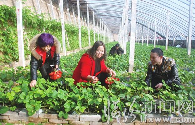 臨汾新聞網訊 近日,在翼城縣唐興鎮封比村草莓大棚內,游客正在采摘奶油草莓。這種大棚采用無土栽培,生物防治,生長的草莓個大色艷、綠色無公害,吸引了許多游客進園采摘,有力地促進了農民增收。記者 李自強 攝