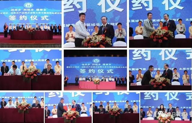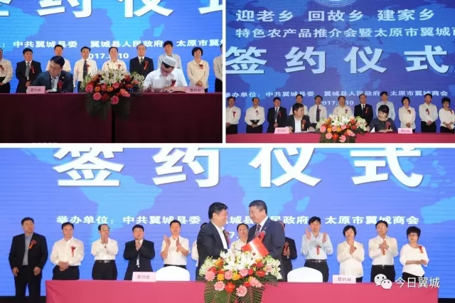 高永賢代表翼城縣人民政府,分別同北京華拓集團公司總經(jīng)理石文杰,中線渠首(北京)農(nóng)業(yè)發(fā)展有限公司總經(jīng)理張之洞,山西果信農(nóng)業(yè)科技發(fā)展有限公司總經(jīng)理焦強,山西省農(nóng)業(yè)資產(chǎn)經(jīng)營有限責(zé)任公司總經(jīng)理冀成剛,山西瑞石藝術(shù)文化傳媒有限公司總經(jīng)理楊瑞褒,杭州海康威視數(shù)字技術(shù)山西公司總經(jīng)理唐佳峰,華夏微影山西公司、山西國投文化產(chǎn)業(yè)開發(fā)公司總經(jīng)理孫金剛,山西景吾通科技集團總經(jīng)理馬立新,太原一建集團公司、山西輔國房地產(chǎn)開發(fā)有限公司總經(jīng)理王貴聰,山西新浪信息技術(shù)服務(wù)有限公司總經(jīng)理申元華簽訂了翼城縣河上公德山旅游開發(fā)建設(shè)項目、萬畝有機小米種植及加工項目、千畝櫻桃種植園項目、翅果油合作開發(fā)、文化創(chuàng)意產(chǎn)業(yè)項目、智慧城市建設(shè)、華夏微影文化小鎮(zhèn)、景區(qū)旅游開發(fā)、霸國遺址公園合作開發(fā)、電子商務(wù)等十個項目。同時,晉味道飲食公司與翼城縣伊圣發(fā)農(nóng)副產(chǎn)品合作社簽訂了特色農(nóng)產(chǎn)品項目,太原市翼城商會分別與山西上海商會、交通銀行山西分行簽訂了山西上海合作協(xié)議、交通銀行合作項目。簽約項目涉及全域旅游、設(shè)施農(nóng)業(yè)、民生事業(yè)、市政建設(shè)、工業(yè)經(jīng)濟等方面,簽約總投資金額超過70億元。