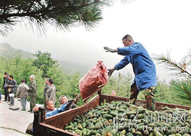 臨汾新聞網訊 近日,在翼城縣西閆鎮大河村,村民們在裝載松果。眼下正是松果成熟的季節,西閆鎮今年預計能產松果500萬公斤,村民采摘松果每公斤勞務費1元左右,每人每天可增收約200元。