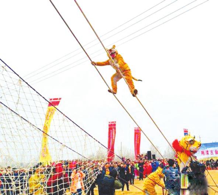 “老虎上山”表演大都選在開闊場地。首先,在場中央豎起一根高達15米的老桿,其上用門板搭建一個平臺,再固定兩把椅子作為“假山”,老桿前后各拉兩條碗口粗的麻繩成斜坡狀固定起來,形成云梯。