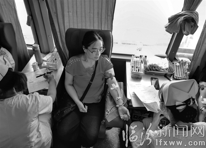 圖為群眾在獻(xiàn)血車(chē)內(nèi)獻(xiàn)血。