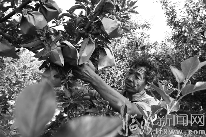 臨汾新聞網訊 近日,翼城縣里砦鎮的村民韓躍進正在自家的果園內忙著給蘋果套袋。入夏以來,果農們抓住果樹生長的關鍵期,加強果樹病蟲害防治、修剪、施肥和澆水等管理,確保蘋果增產增收。