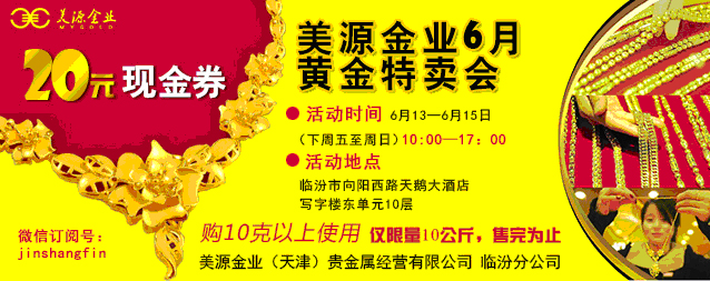 2014年6月13、14、15日,美源金業(yè)為回饋新老客戶,特在臨汾市向陽(yáng)西路天鵝大酒店寫字樓東單元10層舉辦“黃金特賣會(huì)”,底價(jià)特賣三天,在此基礎(chǔ)上總價(jià)再次現(xiàn)金減免,優(yōu)惠前所未有,購(gòu)買熱潮火爆來(lái)襲!
